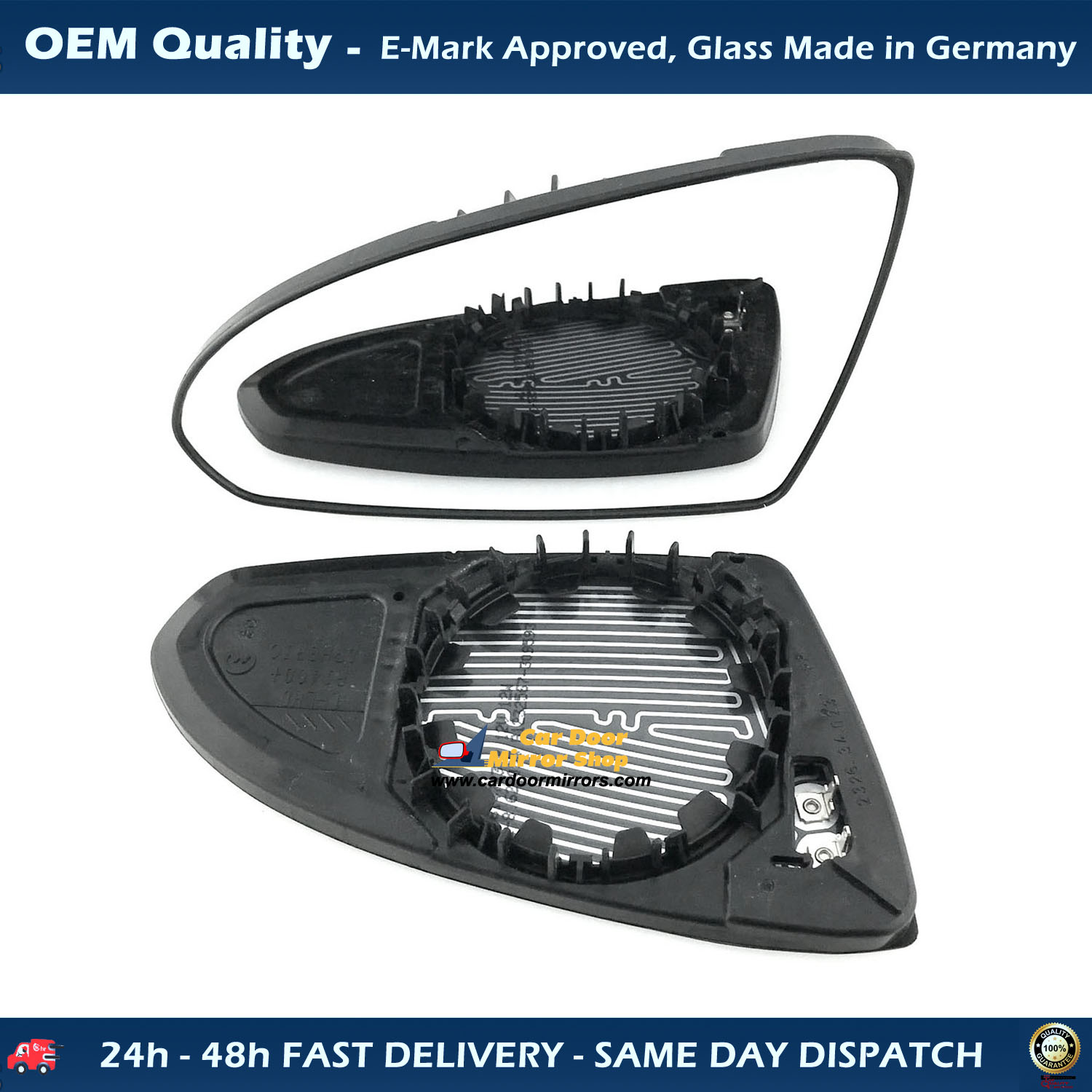 This Wing mirror is a High Quality Brand New Replacement for Original Equipment Front Glass is made in GERMANY, Comes with Pre fitted Backing/Base Plate to clip straight on to the Mirror Housing of any Electrical & Manual Mirrors.